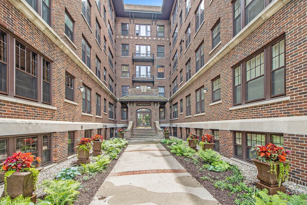 The best of the best in the iconic Marlborough Building with your own private parking garage. All the details are here in this lovely 2 BR, 2 full bath condo that has been beautifully restored and updated. LR, dining area and kitchen have glowing, engineered, hardwood flooring. The kitchen and coordinating Butler Pantry (designed by Abode) have warm cherry cabinetry, lighted end cabinet, granite countertops with bar seating, tile backsplash, stainless sink, wine rack, and all appliances. The gas log FP has ceramic tile surround. In the primary bedroom you'll find customized dual closets, seating area and an adjoining full bath and laundry. All window treatments (Hunter Douglas) stay. One car garage (#35) Assoc. fee includes ground and snow maint., trash, water, and property insurance. Relax in the shady, landscaped, lawn area. Or enjoy the view from the rooftop patio. Located near Bronson Park, Kalamazoo Institute of Arts, Breweries and Downtown.