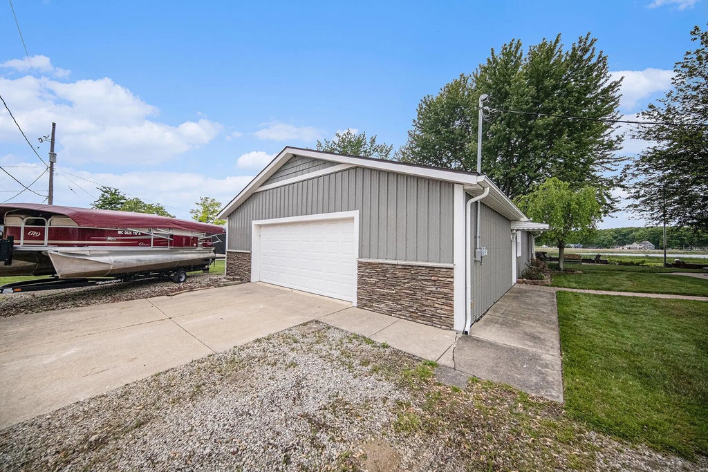 Experience the pinnacle of waterfront luxury in this stunning 4-bedroom, 2-bathroom lakefront estate. Nestled on a pristine shoreline where you can watch nesting swans, this home boasts breathtaking panoramic views through a full wall of floor-to-ceiling windows, flooding the open-concept living space with natural light. The heart of the home is a massive chef's kitchen featuring high-end appliances, custom cabinetry, and expansive Quartz countertops, perfect for entertaining or quiet mornings with a view. A grand dual staircase makes a striking architectural statement and leads to generously sized bedrooms designed for comfort and style. The upstairs bathroom is a true spa-like retreat, complete with heated floors for year-round comfort and luxury. Step outside to your fully finished walk-out patio, where a serene waterfall sets the tone for tranquil evenings by the water. Whether you're hosting guests or simply enjoying a peaceful retreat, this outdoor space is a true sanctuary. But it doesn't end there! A remarkable pole barn offers even more luxury and utility, complete with a temperature-controlled wine cellar and a custom wood workshop. Just outside there is an underground RV pad built into the yard for hidden convenience along with a whole house/barn generator. It's the perfect blend of elegance and functionality. This one-of-a-kind property redefines lakefront living. Private, spacious, and masterfully designed for those who appreciate the finer things.( For a full list of updates and specialty items, check out the attached sheet in the document section of the mls.)
