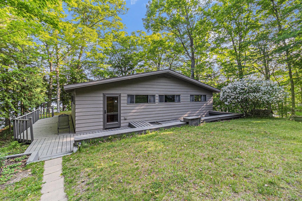 One of a kind HAMLIN LAKE property! Owners have owned this peninsula on Hamlin lake with OVER 700 FEET of private water frontage since late 1950s. Main home is 1365 sq ft ranch and the boat house is 774 sq ft. There are multiple buildings on the property currently used as storage sheds. Property can be split, keep one parcel and have the other for an investment!. New windows and kitchen appliances 2022. Washing machine 2025. Electrical updates and new furnace 2024. Natural gas available at road/gate. Circle driveway makes for easy access and parking. Slight slope to waters edge has a trail and also an area for ATV or golf cart. Michigan basement provides extra storage. This gem is perched slightly on a slope for panoramic lake views. Sold fully furnished. Buyer to verify all information.