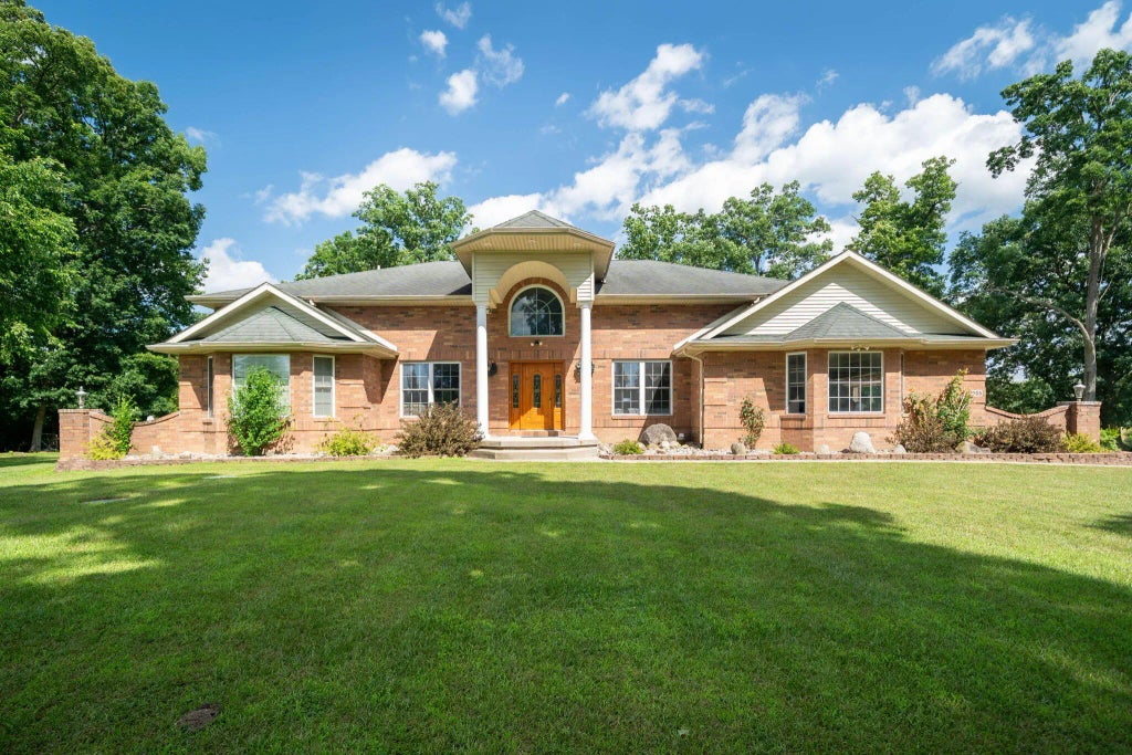 Napoleon the Chihuahua says: ''WOW! WOW! WOW!'' This custom-built brick home with a three stall garage, is wow through out! From the great room entry featuring vaulted ceilings and a wide grand oak staircase, pass through the arch way to the kitchen or the dining and living rooms. The master suite and a second bedroom connected to a full bath, complete the main floor. Upstairs, there are two bedrooms each with private bathrooms, and an office area. The finished basement has three bedrooms, and a full bath, rec room, office, and plenty of storage. Outside, there is a large 20' x 20' deck, a 32' x 48' pole barn, which will be finished, and 34 acres of land, which used to be a farm and a forest, to roam, hunt, and enjoy the wildlife.
