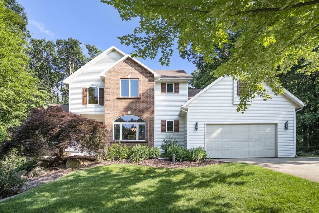 Beautifully custom-built retreat in the sought-after Austinridge neighborhood, Caledonia Schools! Nestled on a private 3/4 acre wooded lot with a lush yard and landscaped gardens. This 5-bedroom, 3.5-bath home with a 3rd stall tandem garage offers over 4000 square feet of finished living space providing both space and serenity. The main floor boasts hardwood floors and fresh neutral paint throughout. The spacious, eat-in kitchen has been thoughtfully updated with shaker-style cabinets, quartz countertops, and a large center island. The spacious sunlit living room is sure to impress with vaulted ceilings and a cozy fireplace, while the elegant dining area, separate den/living room offer flexible spaces for relaxation or work. A convenient combined laundry and mud room adds everyday convenience. Upstairs, the updated primary suite features a walk-in shower, soaking tub, and generous closet space. Three additional well-sized bedrooms, another full bathroom, and a walk-in linen closet provide ample room for family or guests. The finished walkout lower level expands your living space with a fifth bedroom, full bathroom, a spacious living room, game room and a large storage room. Enjoy outdoor living with an expansive deck, a large yard with a generous flat area to play, and a fire pit area wired and ready for a hot tub. Additional features include underground sprinkling, an additional parking pad on the side of the home, and a 3rd-stall tandem garage/workshop. Roof is less than 6 years old and all mechanicals, including the zoned furnace, are newer than 10 years. Don't miss your chance to make this home your own!