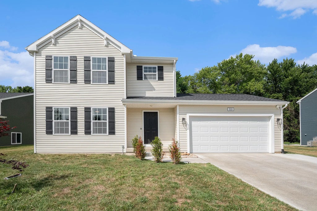 Better than new! This home was built in 2023 and offers 4 bedrooms, 2.1 baths and 2 car garage at Trumpetor Bay. The main floor features a large great room, a spacious kitchen with a dining nook, a convenient main floor laundry room, a powder room, and a spacious mudroom. Kitchen features white cabinets, a breakfast bar with pendant lighting, granite counters, tile backsplash, and SS appliances. Upper level boasts a primary suite complete with WIC and private bath, 3 spacious bedrooms, and another full bath. Enjoy an open floor plan with an abundance of natural light. Recent update including, landscaping, and planted grass lawn, poured concret patio with outdoor lighting, security cameras, updated ceiling fans new lighting fixtures, smart switches, added 5ft concrete to widden driveway.