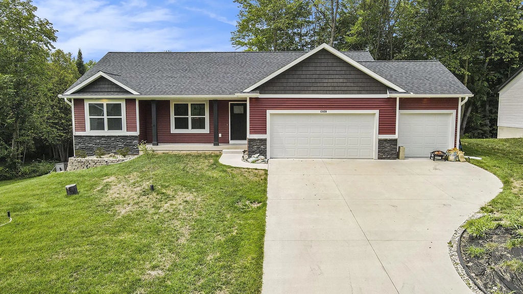 Welcome to this 2023-built ranch in Spruce Forest Cove, set on nearly 3 wooded acres with private frontage on Muskellunge Lake. This 2-bed, 2-bath home features 1,390 sq ft of main-level living with , open layout, main floor laundry, and an extra-large soaking tub in the primary suite. School of choice Greenville, Belding or Cedar Springs. The daylight lower level is unfinished and offers potential for 2 additional bedrooms, a family room, and a bathroom. 3 stall garage with 220, floor drains and hot and cold water. enter lock for natural gas generator quick release. Integrated TP link system. Enjoy peaceful surroundings and wildlife from the spacious 12x20 deck. Outbuildings are allowed. Land already cleared. Located in Spencer Township, just 30 minutes from Grand Rapids.