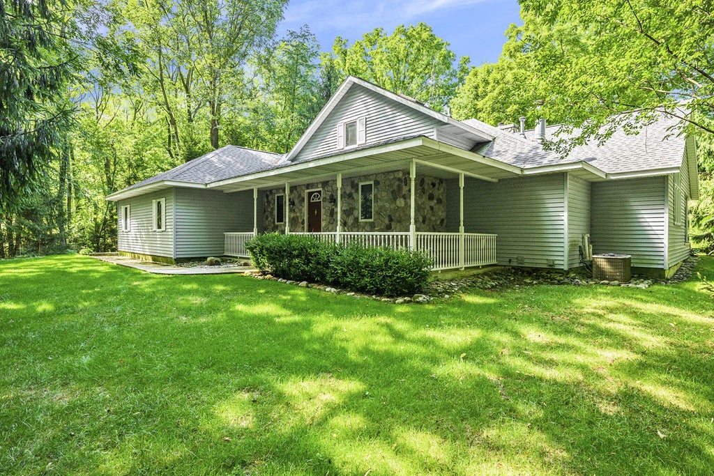 Tucked away in a private and tranquil wooded setting on 1.38 acres, this well-maintained home offers the perfect blend of comfort and nature. Featuring four spacious bedrooms and three full baths, it boasts a thoughtful floor plan with the convenience of main floor laundry. The inviting living spaces include two fireplaces for added warmth and charm, a wrap-around front porch ideal for relaxing, and a beautiful enclosed three-season room overlooking the serene, private backyard. Recent updates include a newer roof, providing peace of mind for years to come