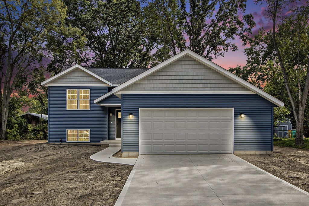 New Construction! This spacious bi-level offers 1055 sqft of living space and has many extra features you will love! As you enter you will appreciate the large landing with coat closet. The kitchen features Quartz countertops, subway title backsplash, and sleek stainless-steel appliances. The open concept kitchen, dining, and living space has cathedral ceilings. The large primary bedroom offers a walk-in closet and direct access to the full bathroom. The Lower level has several daylight windows giving you options for adding additional bedrooms and living space. Some lower-level framing has been started and there is rough in plumbing for a future second bath. The oversized garage (26 X 22) is great for larger vehicles or storage, and another bonus is that the garage has been fully insulated and drywalled. This home is situated on just over a 1/3-acre lot on a quiet street that is within walking distance to the downtown area and schools. Tour today and make this brand-new home yours!