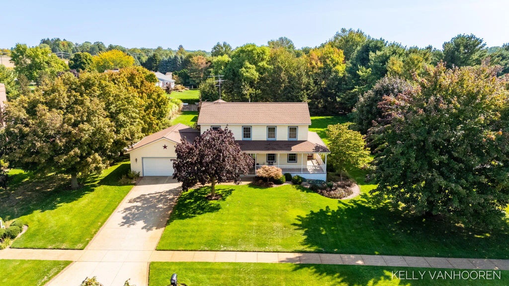Spacious 4-bedroom, 2.5-bath home in the heart of Byron Center! A welcoming wraparound porch with side entry leads to a flexible main-level office. The first floor features a huge living room, open kitchen, dining area, half bath, and convenient laundry. Upstairs you'll find oversized bedrooms with large closets and two full baths, offering comfort and function for everyone. The daylight basement is plumbed and ready to finish for added living space or storage. The property sits on nearly an acre, with a fenced backyard, garden potential, and an extra two-stall garage. Conveniently located near Blue Ribbon schools, healthcare, shopping, and dining—yet with a private backyard retreat—this home offers the best of both space and location.