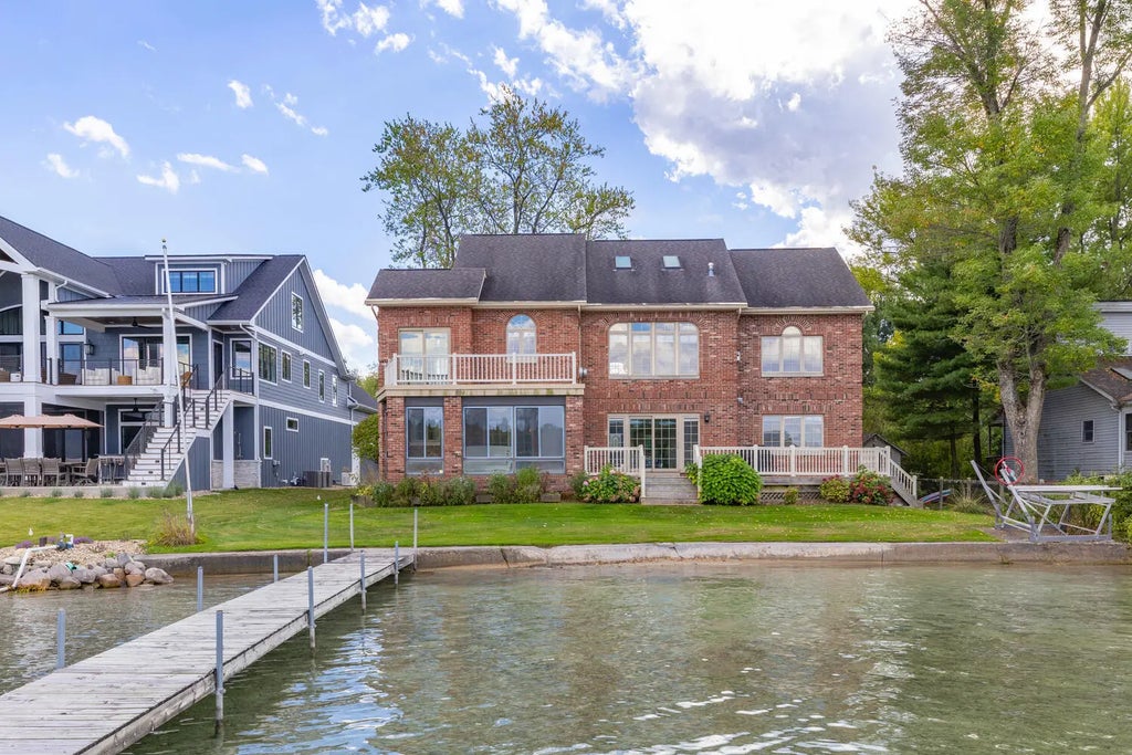 This stately four-bedroom, two-bath, two-half-bath, one-owner brick home on one-third acre with 74 feet of sandy waterfront has a comfortable downstairs for lake-life activities and an elegant upstairs with a balcony for elevated views of Diamond Lake. The main level has a living area with access to a large deck, a summer kitchen with stainless appliances and access to a sunroom and the deck, three bedrooms, a laundry, and a powder room. Upstairs are a carpeted living area with built-in cabinets and shelves, skylights, and a gas-log fireplace; a recently remodeled kitchen with wood floors and balcony access; a formal dining area with arched windows; a large carpeted primary bedroom with a gas-log fireplace; a primary bath with dual vanities, tiled standup shower and walk-in closet; and an office above the attached two-car garage and storage room. The property includes a dock with sunning platform and a dry crawlspace for utilities. Some furniture and furnishings are negotiable.