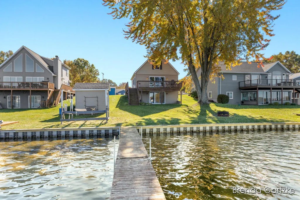 Waterfront living with 60ft on the main body of water on Indian Lake. Private lake access, this home has potential 3rd non-egress bedroom/office in lower level, large utility room with newer water softener, water heater, AC, metal rooff, & well pump W/ a walkout level to the water & great patio. Main floor offers a primary bedroom, a bath with laundry closet, kitchen and open LR with vaulted ceilings & eating area with an expansive deck overlooking the lake. Up is a bedroom and loft sitting area or room for a workstation area. T&G ceiling. A shed for extra storage is by the lake. Dock included. The lake offers 5 parks, great fishing, organized community activities, July 4th activities, all within a 50 min commute to Grand Rapids and 30 min to Rockford.